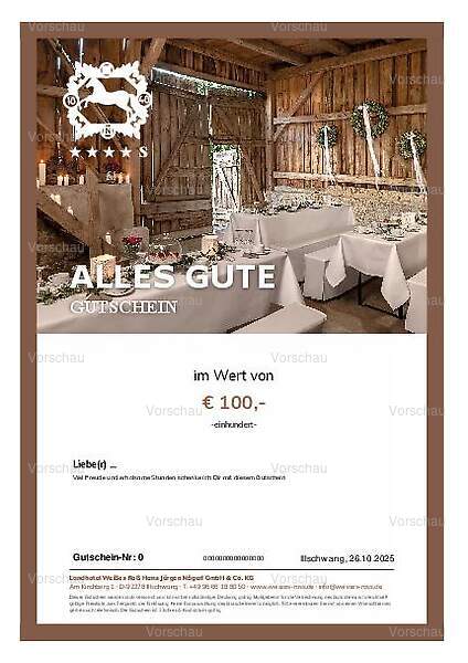 Mit der Gutschein-Vorschau können Sie überprüfen, ob Sie eventuell zuviel Text eingefügt haben. Wenn die letzten Zeilen in der Gutschein-Vorschau abgeschnitten werden, müssen Sie Ihren Text bitte etwas kürzen!